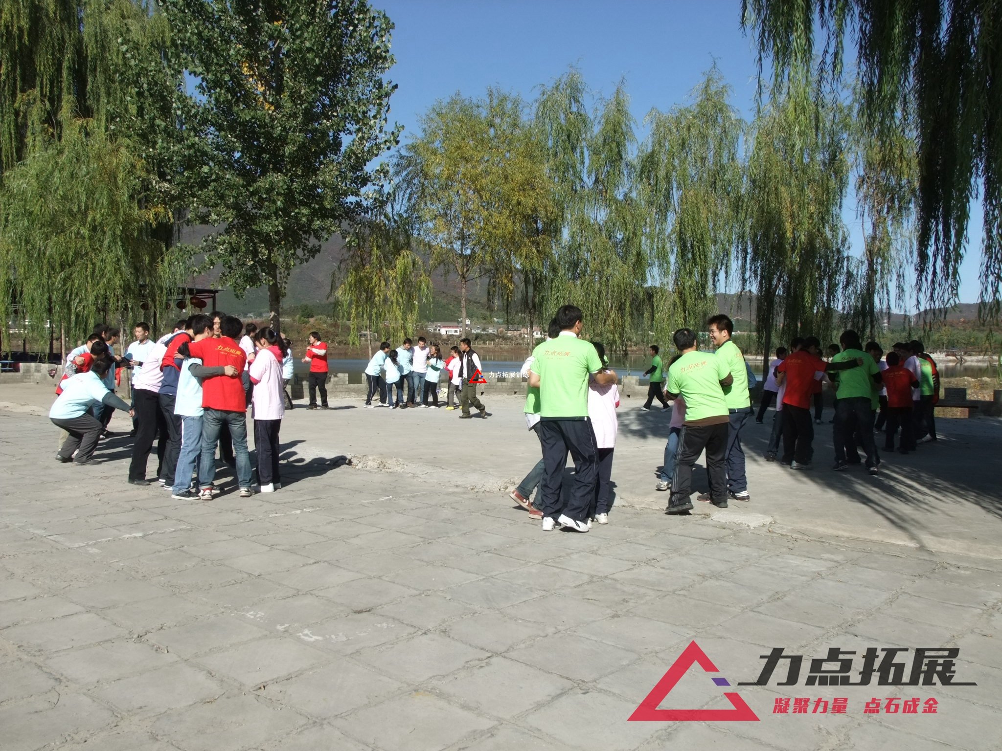 同舟共濟:各小組按照組織者事先提供的原始竹料、木板、繩子等,自行設計、制作一只竹筏,并用自制的竹筏劃過規(guī)定的航道……,所用原材料和工具較少、制作及劃行速度較快、失誤(有人落水)較少的隊獲勝。