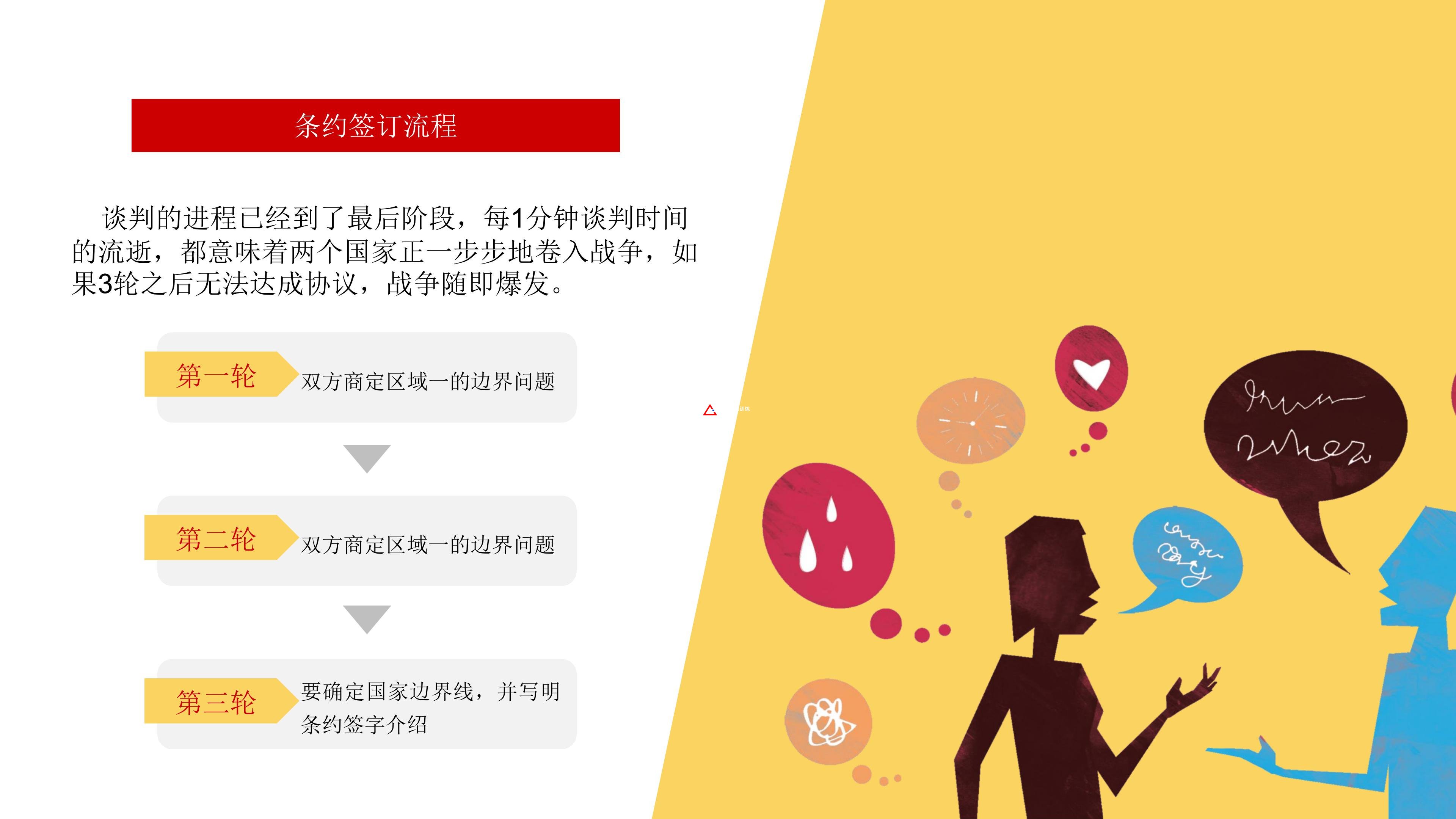 在這次談判會議上,如果不能解決邊界的爭端,則可能會導(dǎo)致兩國之間的戰(zhàn)爭。為了阻止戰(zhàn)爭,談判會議必須拿出一個(gè)讓雙方都同意并在其上簽字的條約。
