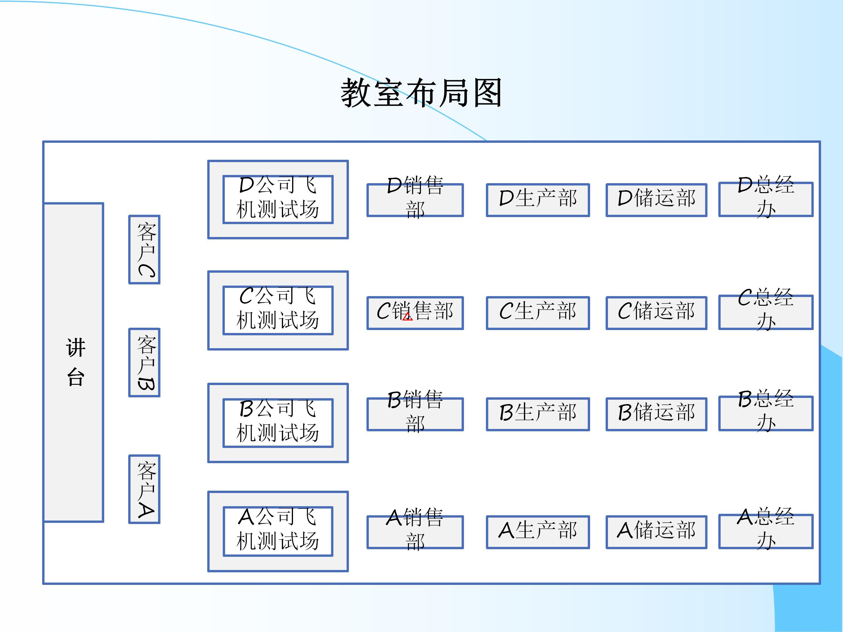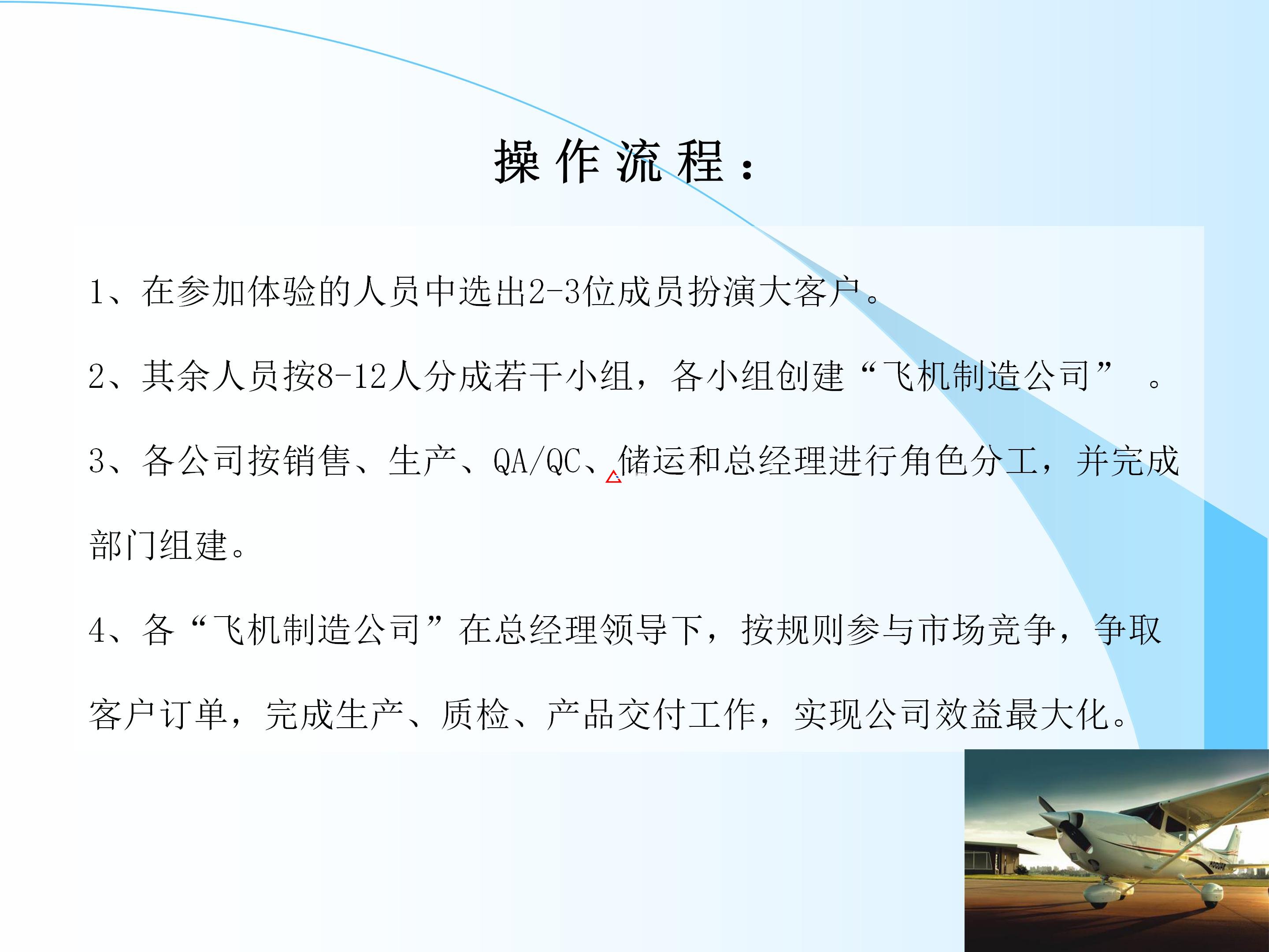 4、各“飛機(jī)制造公司”在總經(jīng)理領(lǐng)導(dǎo)下,按規(guī)則參與市場(chǎng)競(jìng)爭(zhēng),爭(zhēng)取客戶訂單,完成生產(chǎn)、質(zhì)檢、產(chǎn)品交付工作,實(shí)現(xiàn)公司效益最大化。