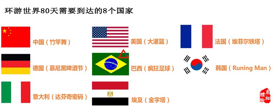 項目規(guī)則:所有隊員分成若干個隊伍,每隊為一個探險小組,需要在最短的時間內(nèi)環(huán)游世界8個國家并且完成不同的挑戰(zhàn)任務!